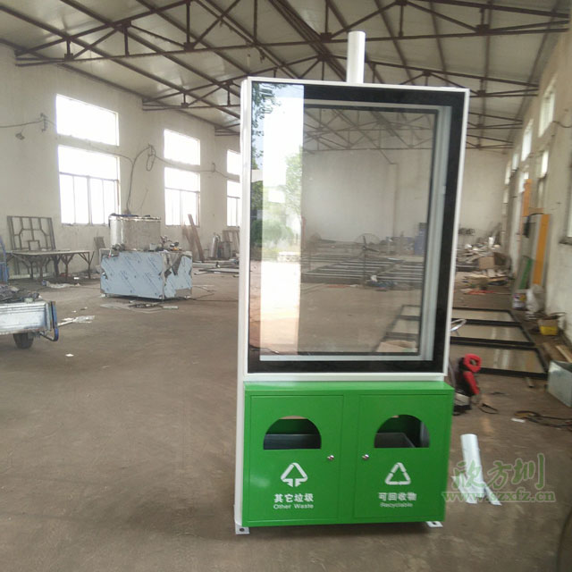 ? 公交站臺廣告垃圾桶生產制作常用的材質有冷軋鋼、不銹鋼、玻璃鋼;產品造型經典時尚,整體結構牢靠,箱體箱底連體式設計,底座可固定地上,抗打擊,抗風力??刂葡潴w高度,廣告桶高度設計在1.8米左右,符合城市規劃要求。獨特的抽屜式斜插內桶減輕環衛工人清理勞動強度,投口與清理口一體設計,便于垃圾入箱及清理。廣告垃圾箱具有投入成本低,直接受眾效果好。