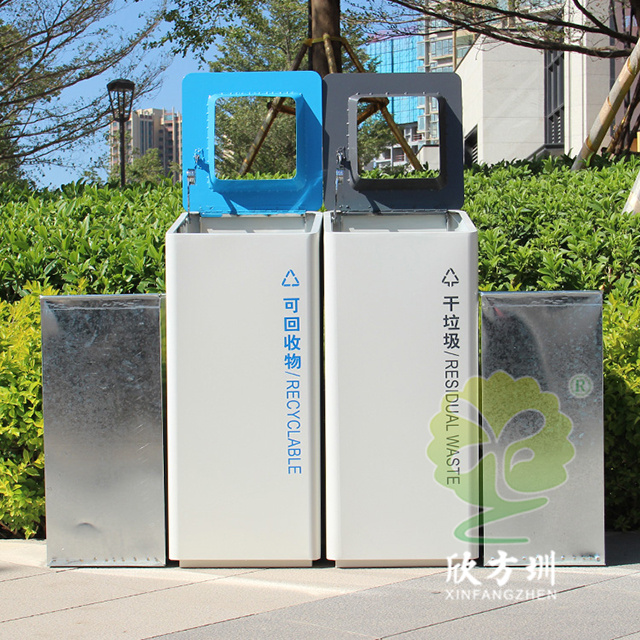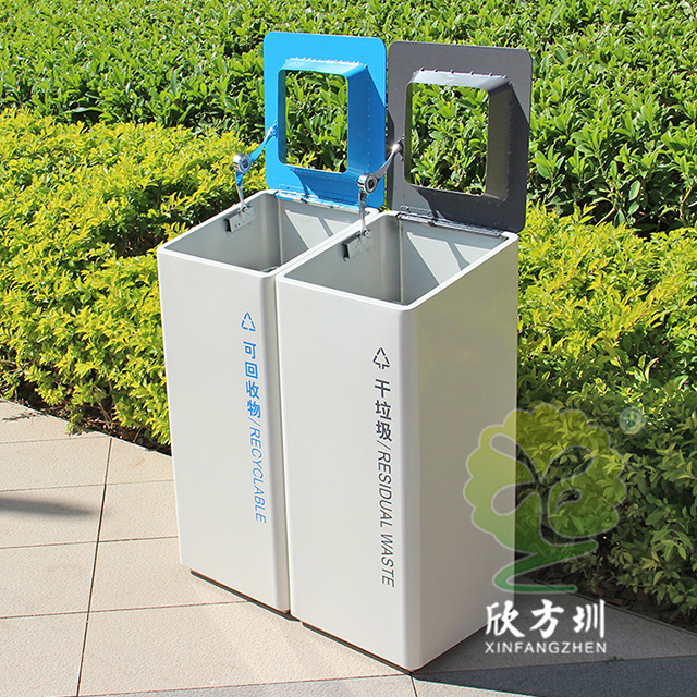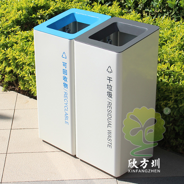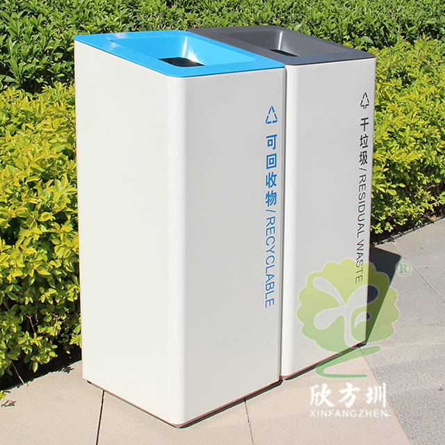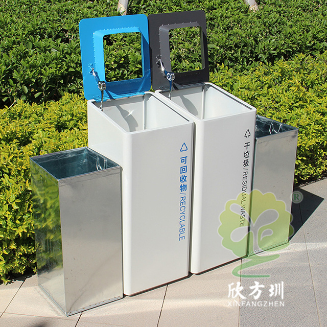 上海商場不銹鋼分類垃圾桶采用2014#不銹鋼板制造而成,產品型號:JP126-2,尺寸規格:320*320*760mm,垃圾桶材質:外桶不銹鋼,內筒材質:鍍鋅板,不銹鋼板材厚度:1mm,桶身顏色:米白色,方形立式直投口室內組合式雙分類設計,可回收物垃圾桶桶蓋跟標識分別噴塑絲網印刷了天藍色顏色和干垃圾分類標識和桶蓋絲印和噴塑灰色,標識下方英文標識,能快速區分廢物的分類,方形垃圾桶投口撐桿開蓋方式能方便取出內部的鍍鋅板內筒,這款垃圾桶是上海一個采購在我們欣方圳廠家定制的,我們欣方圳是一家專業定制室內商場垃圾桶、電梯口方形垃圾桶及戶外環衛金屬垃圾桶的廠家。