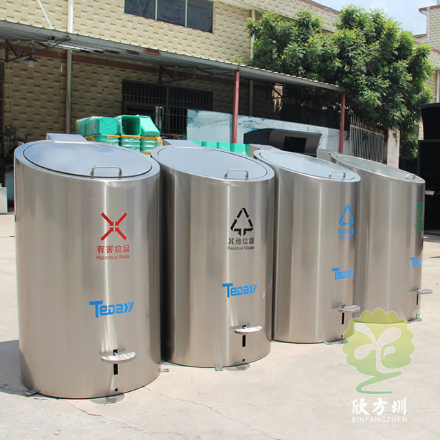 升降地埋式不銹鋼分類垃圾桶頂部采用了圓柱形的不銹鋼腳踏式垃圾桶制作而成,產品型號為:C726,尺寸規格:550*590*990mm,每個不銹鋼垃圾桶可以放著一個1100升的大號的塑料垃圾桶,收集點位于地下2.5米深處,有一些可以放著5個或者4個圓柱形分類垃圾桶看小區物業的需求,有些地方會配置垃圾亭擋雨棚,強力的壓縮機升降設備可以采用開關方便的控制地下的垃圾桶,讓它輕輕松松降上來,一拉塑料垃圾桶上垃圾車掛車方便環衛工人開車過來清理,這款垃圾桶上過很多央視新聞節目,升降式垃圾桶的優勢可以良好的釋放地面空間節省地面上的空間,現在很多城市的小區、城中村、學校工業區等場景都在試應用這款桶。