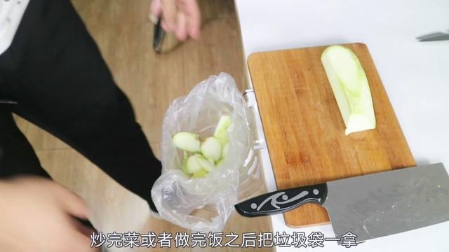 ? ? 我們找一個食物我們切一下我們看一下效果如何?大家看一下壞掉的菜我們就直接把它削掉了不要了,這些沒用的我們就一塊削了去,切完了沒用的菜是不是我們把它扔到垃圾桶里,或者是直接放到菜板上呢?這時沒必要了咱們準備一個垃圾袋