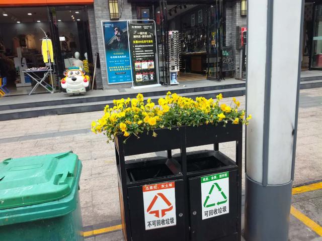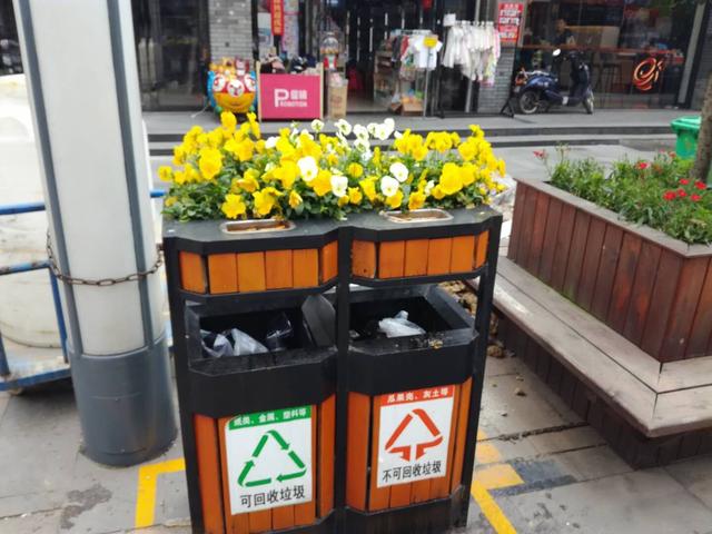 環衛分類垃圾桶上栽花,成為城市風景線