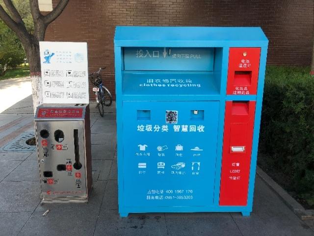 燕依園社區是銀川市生活垃圾分類示范區之一,所轄兩個小區常住人口超八千人。記者走訪看到,小區里擺放著四類彩色分類垃圾桶,還安放了可分區投放電池、溫度計、化妝品、過期藥品、紡織品等在內的智能垃圾箱以及廢舊衣物回收箱。
