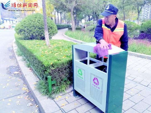 11月11日,記者來到垃圾桶更換現場,,看到路邊的環衛工人正在擦拭新的分類垃圾箱。和其他地方的垃圾箱不同,這個垃圾箱看起來明顯要新很多。