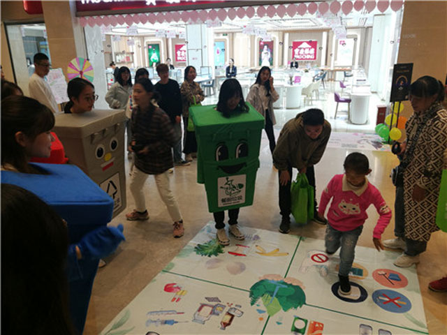 活動現場,居民們參與垃圾分類游戲,將裝扮成不同類型垃圾桶的志愿者帶領到不同種類的垃圾區域。居民們還可以用舊物置換環保袋、參與為地球留言等趣味互動環節。