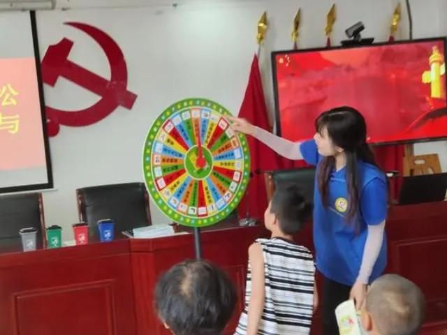 活動現(xiàn)場還設(shè)置了“垃圾分類大轉(zhuǎn)盤”互動游戲,參與者只需隨機轉(zhuǎn)動大轉(zhuǎn)盤,回答出指針最后指向的垃圾所屬類別,答案正確即可獲得禮品一份。大家興致勃勃,紛紛參與進來。不少居民參加完游戲,還意猶未盡地聚在一起討論、學(xué)習(xí)垃圾分類知識。