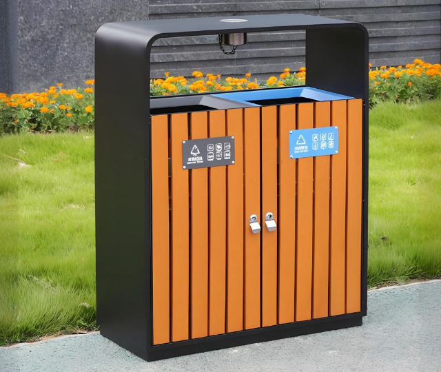 鋼木結構垃圾桶的核心競爭力,源于其材質組合的互補性。鋼材骨架賦予產品極高的抗壓性、耐候性和防盜性能,能夠抵御戶外環境中風雨侵蝕、溫差變化及人為破壞。冷軋鋼板經防銹噴涂或氟碳烤漆處理后,使用壽命可達10年以上,尤其適合人流量大、管理難度高的公共場所。而實木或防腐木飾面的加入,則柔化了金屬的冰冷感,木紋的天然肌理與園林中的植被、石材形成視覺呼應,實現工業制品與自然景觀的無縫融合。