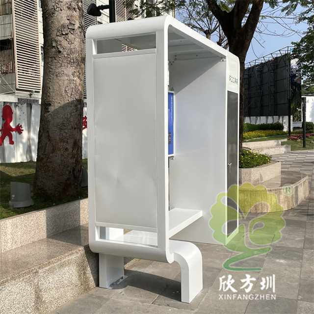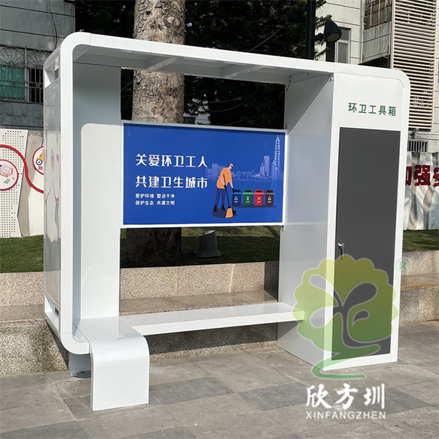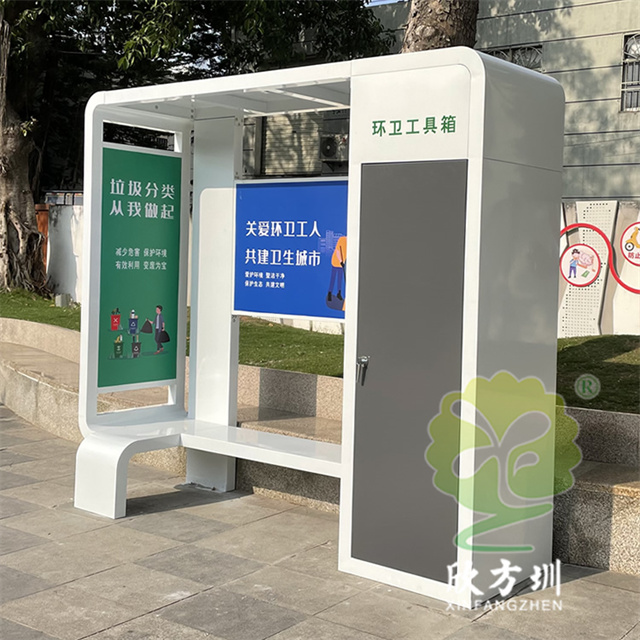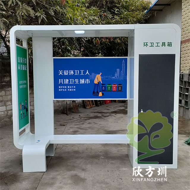 4、垃圾分類亭可開啟換畫面,前透明板材是耐力板,透明度高,耐勞防碎,不傷人,安全有保障。