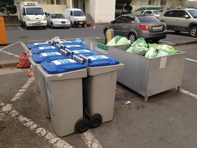 韓國的一處垃圾集中點,左邊藍蓋的垃圾桶放置食物垃圾,右邊開放式垃圾桶放置專用垃圾袋包裝的普通垃圾。