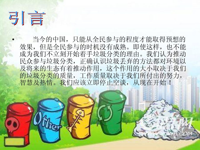 ??? 學(xué)生的可塑性非常強(qiáng),如果教育好了未來(lái)就是棟梁之才,沒(méi)教育好,甚至?xí)?duì)社會(huì)產(chǎn)生危害。所以加強(qiáng)學(xué)生的素質(zhì)教育是當(dāng)今教育界的主流方向,而垃圾分類又是我國(guó)面臨的巨大問(wèn)題,這個(gè)問(wèn)題必然要在學(xué)生的垃圾分類宣傳教育上得到解決,不然垃圾分類永遠(yuǎn)只會(huì)停留在喊口號(hào)上面,下面的小學(xué)生垃圾分類主題班會(huì)ppt,希望能對(duì)教育工作者有用。