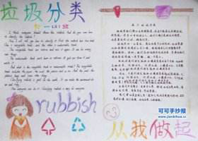 我們每個人一天雖只制造出一公斤左右的量,但是整個地區(qū)加起來,所產(chǎn)生的垃圾量的總和就相當(dāng)大。因此,解決垃圾問題,首先就是以垃圾減量開始,然后做到分類回收,最后才是處理。我們平時所說的“垃圾減量”,實際上有兩層含義:1.減少個人垃圾的生產(chǎn)量:2.拓展垃圾用途,廢物利用,使垃圾不成為垃圾;垃圾分類精美手抄報有分類垃圾桶網(wǎng)收集整理。