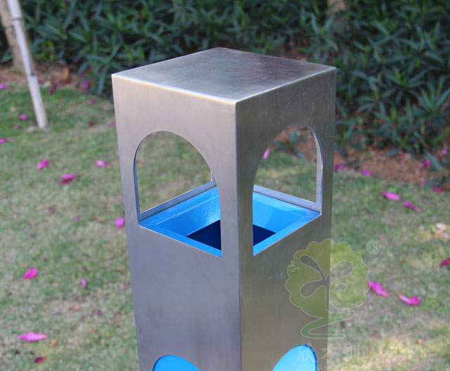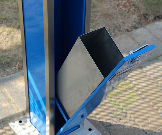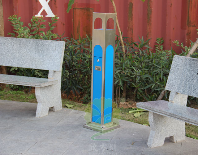C635戶外吸煙柱采用優質不銹鋼剪切、組裝、焊接、絲印而成,不銹鋼具有很好的堅固耐用,防水防銹,時尚美觀作用。它包括外套管、支座、內套管、煙灰盒、底座。外套管的底端固定連接在支座上,外套管的側壁上設有煙蒂置入口,內套管用于集中收納從外套管的煙蒂置入口投入的煙蒂,內套管設在外套管的內管腔中,內內套管的開口端朝上,煙蒂置入口與內套管的開口相連通,以使得從煙蒂置入口投入的煙蒂可從內套管的開口端落入到內套管的內管腔中;
