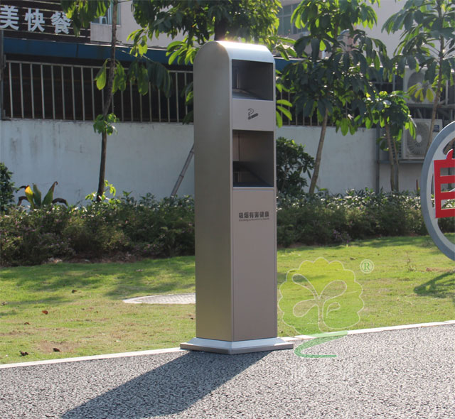 C626復合型果皮箱滅煙柱采用優質不銹鋼剪切、組裝、焊接、絲印而成,不銹鋼具有很好的堅固耐用,防水防銹,時尚美觀作用。它包括外套管、煙灰投放口、內筒、煙灰盒。外套管的底端固定連接在支座上,外套管的側壁上設有煙蒂置入口,內套管用于集中收納從外套管的煙蒂置入口投入的煙蒂,內套管設在外套管的內管腔中,內內套管的開口端朝上,煙蒂置入口與內套管的開口相連通,以使得從煙蒂置入口投入的煙蒂可從內套管的開口端落入到內套管的內管腔中。