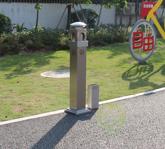 C618室外街道滅煙柱規(guī)格248*248*1175mm,呈長條傳,側(cè)面有三角鑰匙,可以打開側(cè)門,方便清理位于內(nèi)套管的煙蒂煙灰,底座分兩種,一種是室內(nèi)采用的,在底部裝有防滑墊,一種是戶外采用的,底部使用膨脹螺絲。