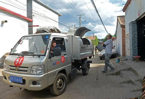 9月1日,在承德市雙橋區雙峰寺鎮村,垃圾清運車在清運村里的生活垃圾。