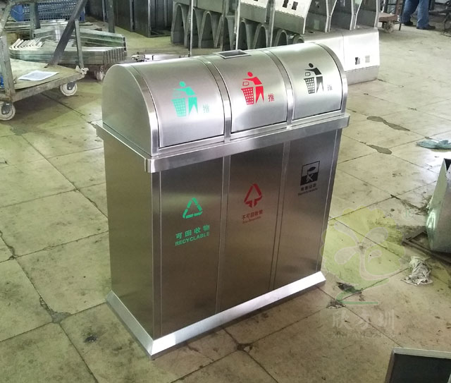 這款垃圾桶采用內外桶雙層模式,內桶使用玻璃鋼內桶,優點是質量輕,堅固耐用,防水防秀,相對于鐵皮內桶來說,使用時間更長,性價比更高。外殼使用優質304不銹鋼作為原材料,擁有良好的防腐防銹功能,使用先進的激光切割機、折彎機經過一系列專業精準的切割、折彎、組裝、焊接、打磨、絲印步驟處理而成。