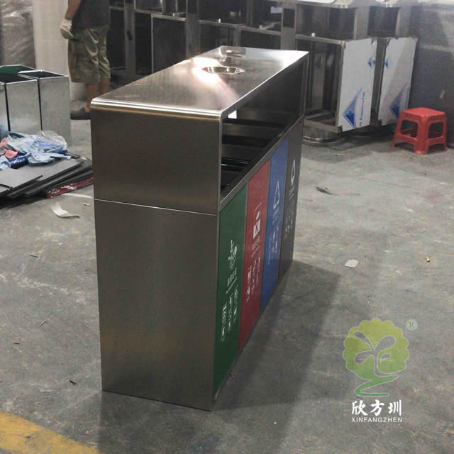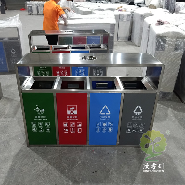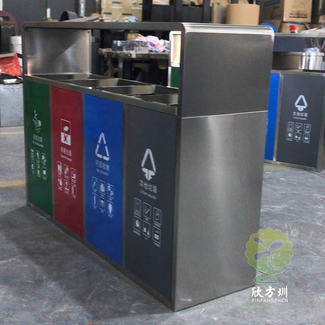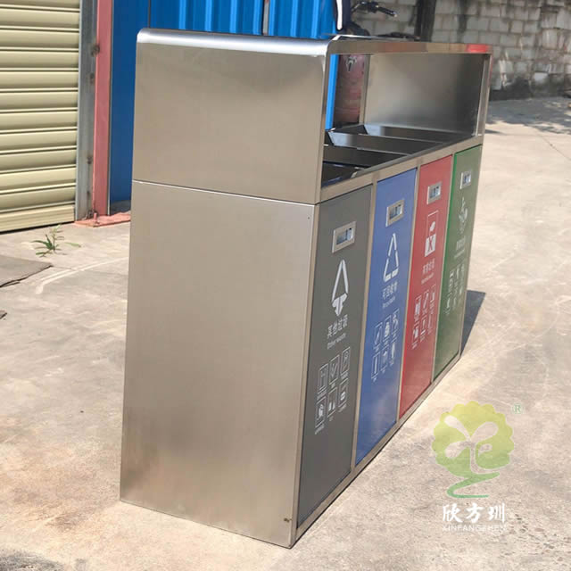 戶外廣場四分類不銹鋼垃圾箱一種存放垃圾的容器,可以采用201、304、316等不銹鋼制作,表面可以采用烤漆、噴塑、鏤空、UV打印等工藝處理,因為不銹鋼耐空氣、蒸汽、水等弱腐蝕介質和酸、堿、鹽等化學浸蝕性介質腐蝕,所以不銹鋼垃圾桶耐用性高。全身不銹鋼制作的垃圾桶還具有防火功能,堅固耐用。