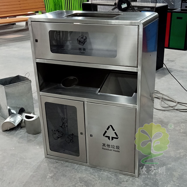 透明不銹鋼分類垃圾桶采用201#,202#,304#優質不銹鋼材料模壓成型,堅固耐用,不易破損;耐火安全,抗高低溫,適合各種惡劣氣候條件;金屬亮澤,高雅美觀,廣泛適用于各種機場、商場高檔場所;內外表面光潔,減少垃圾殘留,易于清潔;配置鍍鋅板內桶,便于垃圾清倒;激光切割開料,尺寸精準,投口無縫焊接成型,打磨拋光處理圓滑不割手,欣方圳不銹鋼分類垃圾桶制作師傅有著多年經驗的熟手,每一道環節工藝成熟,質量可靠,確??蛻羧缙诮桓厄炇?。