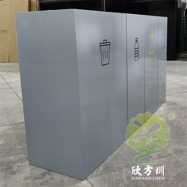 室內商用組合不銹鋼4分類垃圾桶采用了1.00mm厚201#不銹鋼板制造而成,立式直投口組合式四分類設計,分別可以回收紙類、金屬、塑料和帶一個大一點的其他垃圾桶,投口蓋好和正反面絲印中英文文字跟分類標識,紙類投口藍色噴塑跟藍色油墨絲印蓋子白色絲印,金屬黃色噴塑跟黃色油墨絲印蓋子黑色絲印,塑料淺灰色噴塑和黑色絲印蓋子白色絲印,其他垃圾灰色噴塑蓋子跟桶一樣的顏色桶身標識黑色絲印蓋子白色油墨絲印,這樣可以明顯區分辨認桶的分類。