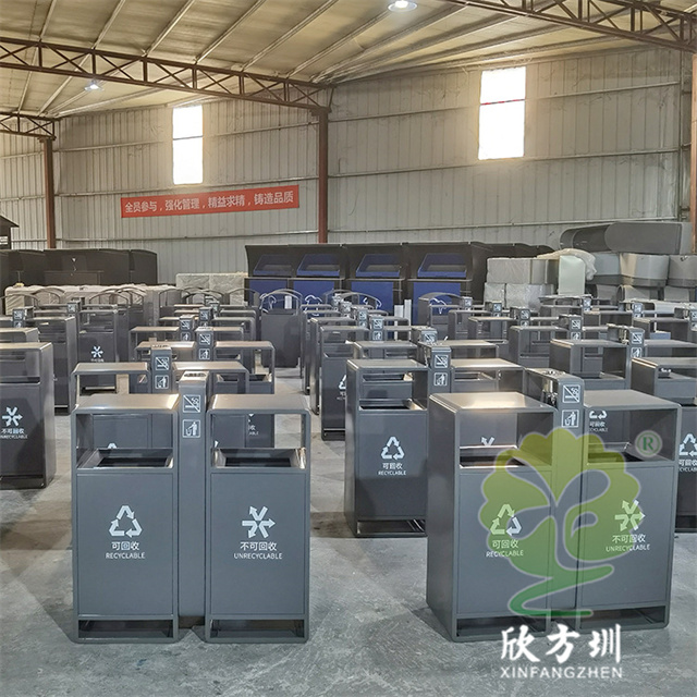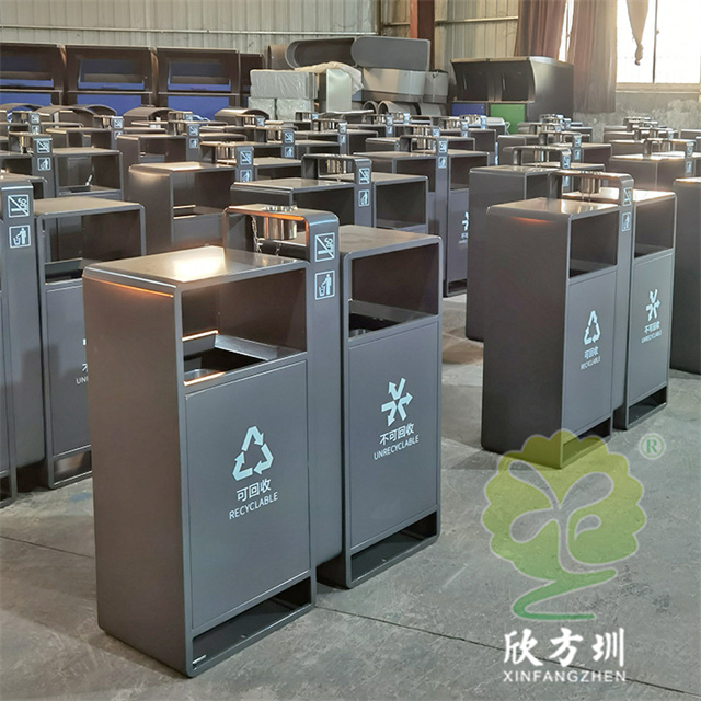 戶外小區(qū)烤漆兩分類不銹鋼垃圾桶材質(zhì)采用了201不銹鋼板1.0毫米厚的,這款垃圾桶想節(jié)約成本也可以采用鍍鋅板以及熱軋鋼板制造,但是會(huì)縮短使用壽命,外觀方形兩連體設(shè)計(jì),表面噴涂噴塑上了一層灰色的的外衣俗稱烤漆,正反面油墨絲印了可回收和不可回收的分類標(biāo)識,頂部中心位置帶一個(gè)煙灰盅,門板帶三角鑰匙可開門取出內(nèi)置的內(nèi)筒。