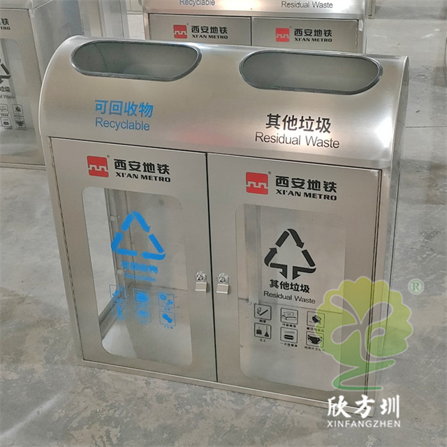 陜西透明防爆不銹鋼分類垃圾桶外筒201不銹鋼,1.2mm厚度(足1.12mm)用戶定制了兩種規格兩分類和四分類的,這款果皮箱不含內筒,桶身正面開門,正面和兩個側面有透明亞克力板4mm厚度(足3.75mm),桶身正面絲印分類標識和西安地鐵的LOGO,投口粘黑色膠條有效防止割到手,可以打木架或者紙箱包裝,帶導軌和彈簧。