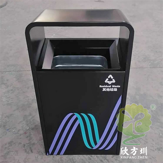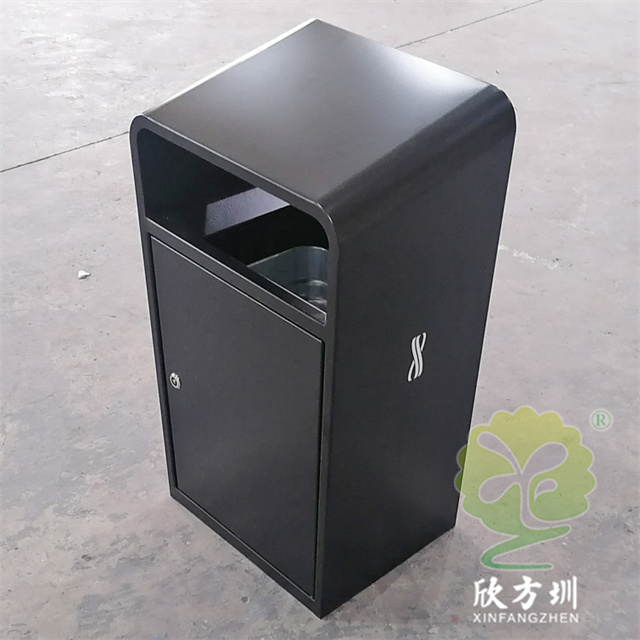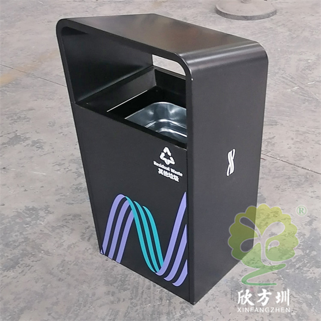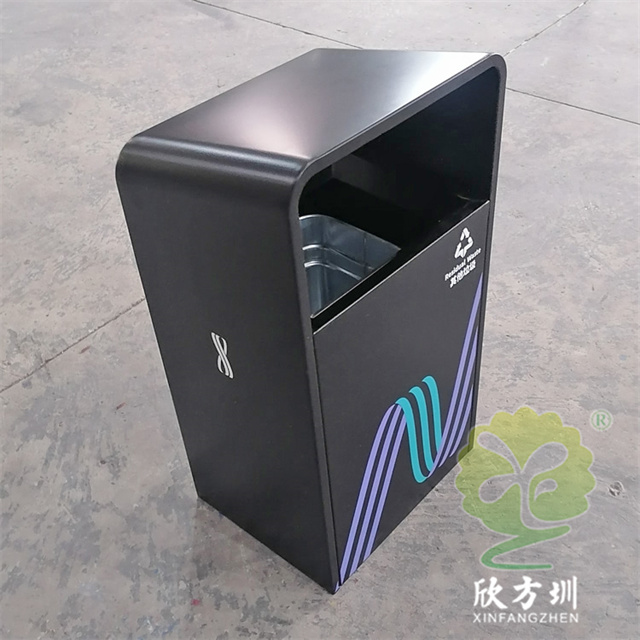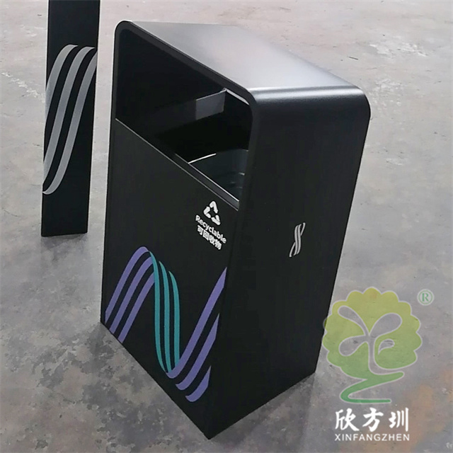 戶外廣場加厚不銹鋼垃圾桶果皮箱這款外筒201不銹鋼 1.5mm 厚度生產,桶身整體黑色噴塑烤漆,絲印企業(yè)logo和分類標識,UV打印彩色圖案,方形單筒頂部坡面前高后低設計,背面可以使用三角鑰匙取出內置的內筒,可以根據(jù)客戶要求定做。