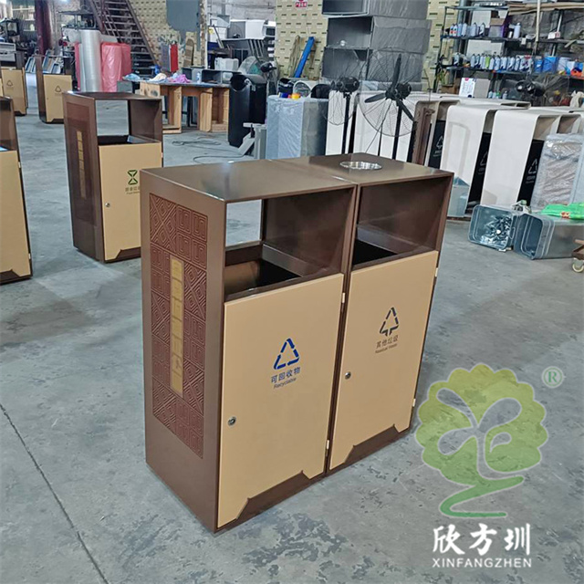 戶外公園噴塑組合式分類不銹鋼垃圾桶整體201不銹鋼1.0mm厚度,不刨槽折彎,框架邊框折彎15mm,單層,框架噴塑,色號潘通7596C,前后門板也噴塑,色號潘通466C,門板下面裝4mm厚度裝飾條噴塑,顏色和框架。