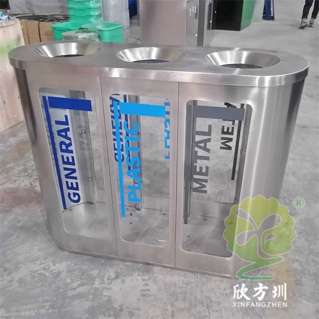 室內(nèi)地鐵站商用透明不銹鋼分類垃圾桶可以選用201或者304不銹鋼板制作,立式橢圓形連體三分類設(shè)計,透明查探區(qū)域可以采用高清的亞克力板或者鋼化玻璃制造,透明板可以絲印中英文文字或者做貼紙,投口圓錐形平滑投遞廢物不易傷手,表面可以噴粉和電鍍支持定制。
