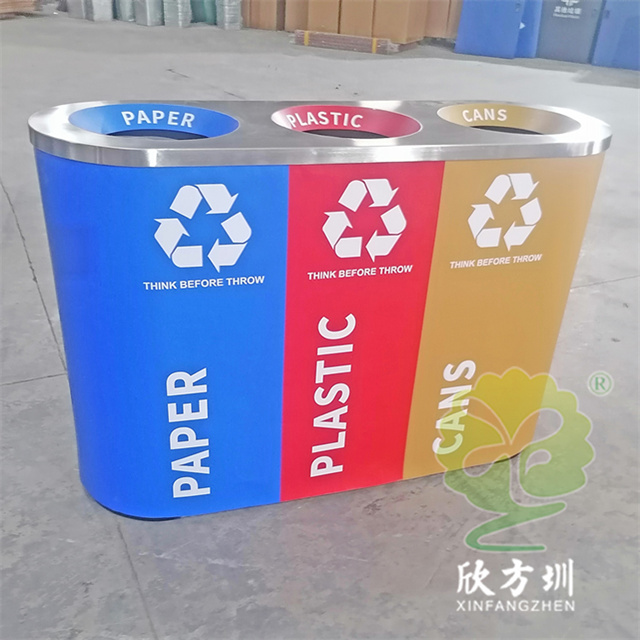 室內商用直投口三分類不銹鋼垃圾桶采用了201不銹鋼1.0mm厚度做的外筒,桶身表面貼三色英文噴繪貼紙,表面可以做電鍍、拉絲防指紋處理、噴塑或者金屬本色等工藝,果皮箱三分類投口坡面設計,支持定制材料顏色尺寸,這款垃圾桶可以提升公共環境的整體美觀度,可以免費油墨絲網印刷國標中英文分類標識及logo。