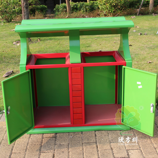 戶外園林冷軋鋼板分類垃圾箱規格:550*400*1000mm,F189采用優質冷軋鋼材料經沖床沖孔、防銹、防腐處理后表面烤漆處理,耐火安全,抗高低溫,適合各種惡劣氣候條件,堅固耐用,不易破損,具有款式多樣化,色澤多樣化,經久耐用等優點。垃圾回收箱底部射有螺栓孔,可將垃圾桶直接與地面固定,在一定程度上也可以防止被偷。本款垃圾回收箱表面經過除油、噴砂防銹處理后,再進行酸洗磷化處理;表面清理干燥后整體進行靜電噴涂或烤漆處理,靜電噴涂是經過流水線高溫固化爐固化后再出爐冷卻,加工后的塑粉附著力強,不易剝落,這樣戶外防銹效果才會好。該款垃圾回收箱樣式比較簡單,是比較常見的一款戶外垃圾桶,在街道、小區、物業、廣場等等眾多的公共場合都在用此款垃圾回收箱。