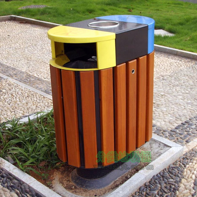 【產(chǎn)品顏色】:以山樟木的原色黃色為主色,覆蓋于桶身;垃圾桶的邊緣的鋼板立柱使用黑色;桶蓋適用黃黑藍(lán)三色,顏色對比鮮明和諧,簡潔大方,實用美觀,還可根據(jù)客戶需求定制。